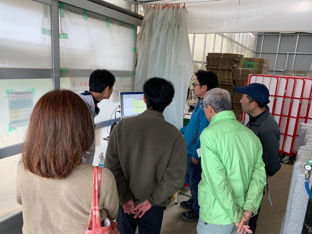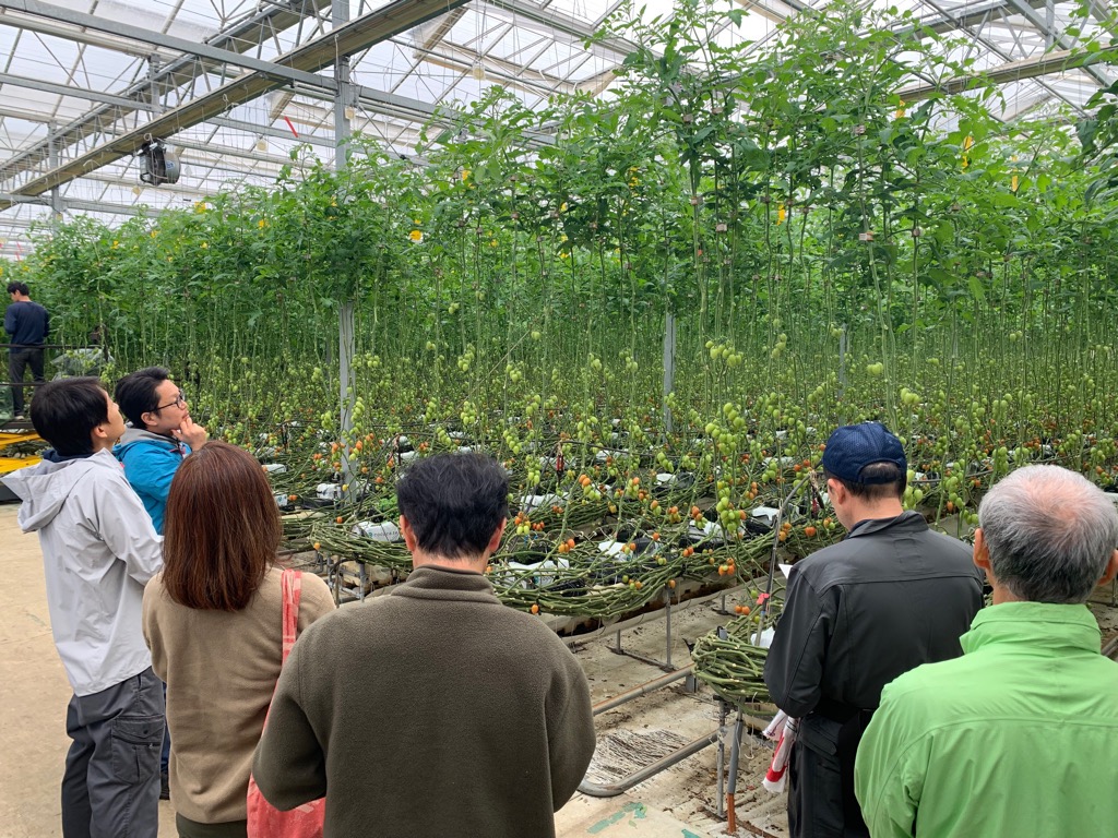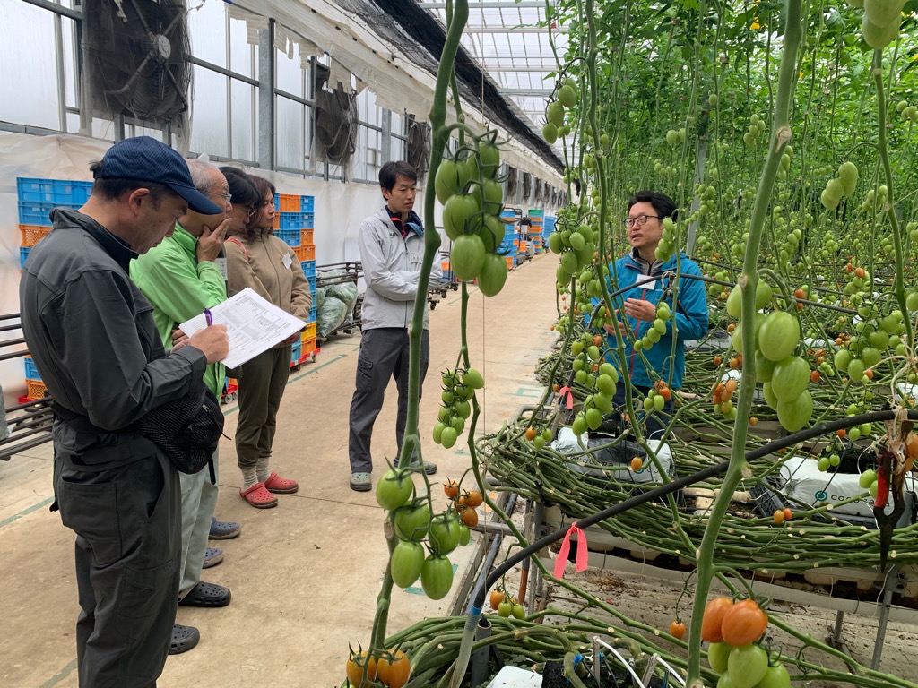農業大国であるオランダの様式を取り入れた栽培施設やパイプハウスでミニトマトを中心に生産を展開しており、温度・湿度・日射量や液体肥料の滴下量に至るまで、データ化・システム化されたハイスペックな農業形態を、米田さんから丁寧に教えていただきました。